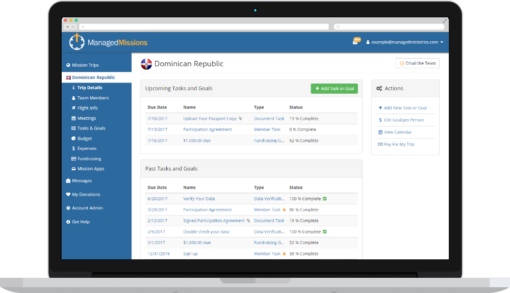 In your Managed Missions account, click the “Tasks and Goals” tab. Here you will see all the due dates for the required paperwork and tasks. Any additional due dates will be communicated to you by the trip leader.